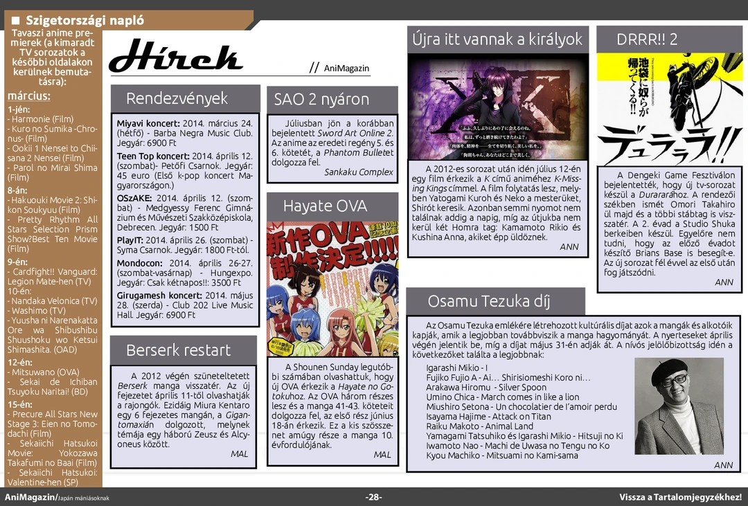 Area88 és Alive! ismertető, Anime Center és Winter-Triumph interjú, bemutató a japán nemzeti parkokról, az Anime Mirairól és a tavaszi szezonról, Tóhoku kiállítás beszámoló, fangirl&fanboy rovat, ecchi ajánló és rengeteg más szuper cikk várja olvasóit az ingyenes online AniMagazin legújabb, szülinapi számában!