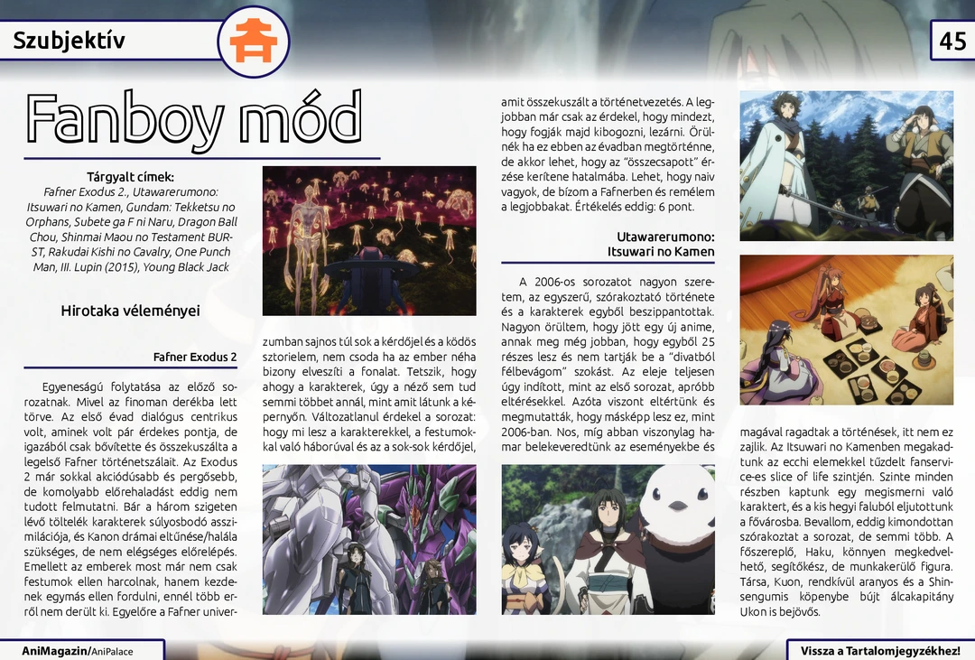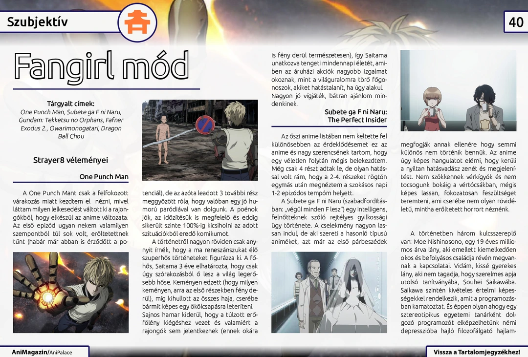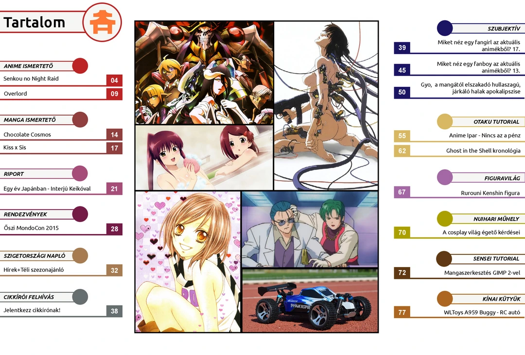 Overlord, Chocolate Cosmos és KissxSis ismertető, “Egy év Japánban” interjú, Őszi MondoCon beszámoló, fangirl és fanboy rovat az aktuális animékről, Ghost in the Shell kronológia, Kenshin figura bemutató és további cikkek várnak az ingyenes online AniMagazin legújabb számában!