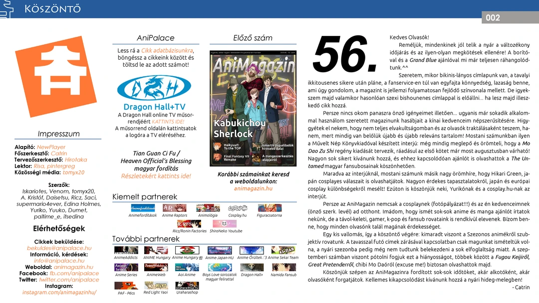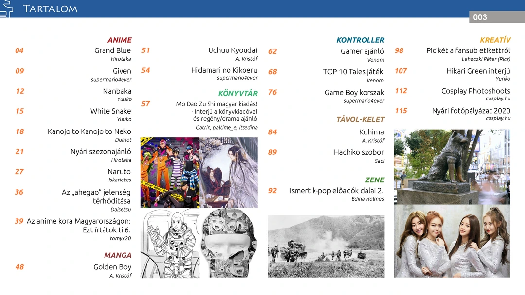 Japán cosplayes interjú Hikari Greennel, továbbá interjú a Mo Dao Zu Shi regény magyar kiadásáról is! Given, Nanbaka, White Snake és nyári szezonos ajánlók, folytatódik a K-pop rovat és véget ér Az anime kora Magyarországon cikksorozat, Uchū Kyōdai és Hidamari no Kikoeru manga ismertetők, TOP 10 Tales játék és gamer ajánló az újdonságokról, Hachiko szobor bemutató, nyári cosplayes fotópályázat nyertesei, valamint további remek cikkek az ingyenes online AniMagazin legújabb számában!
