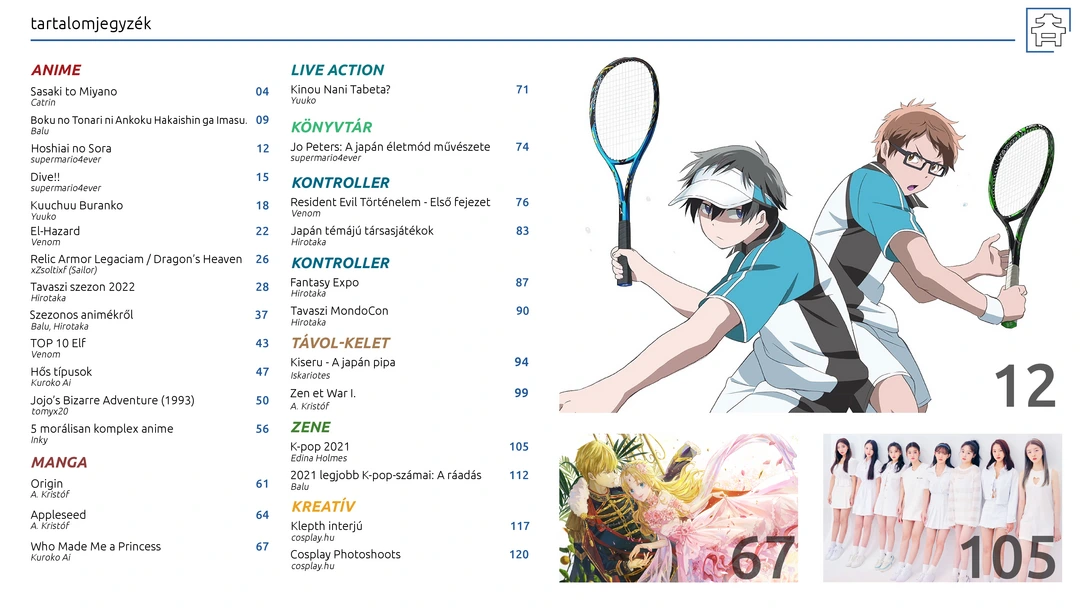 11 éves lett az AniMagazin! Hoshiai no Sorai, Kuuchuu Buranko és El-Hazard anime ajánlók, vélemények a téli szezonos animékről, tavaszi szezonajánló, JoJo (1993) és TOP 10 elf bemutatók, Fantasy Expo és MondoCon beszámolók, k-pop, manga (pl. Origin) és játék (pl. japán témájú társasjátékok) ajánlók, Klepth cosplay interjú, és további remek cikkek az ingyenes online AniMagazin legújabb számában!