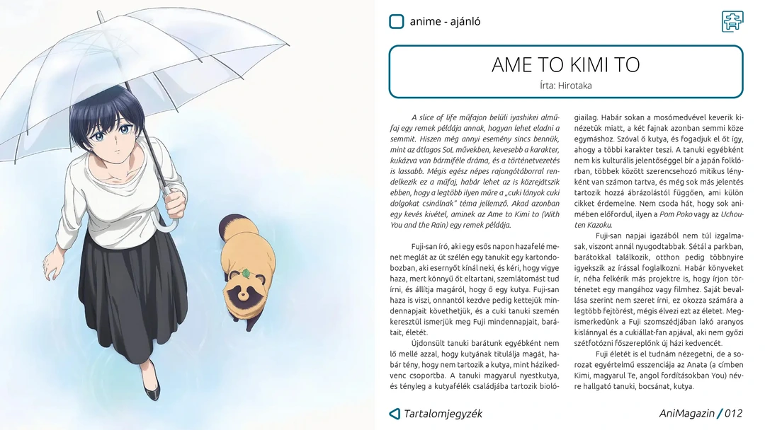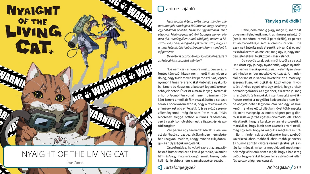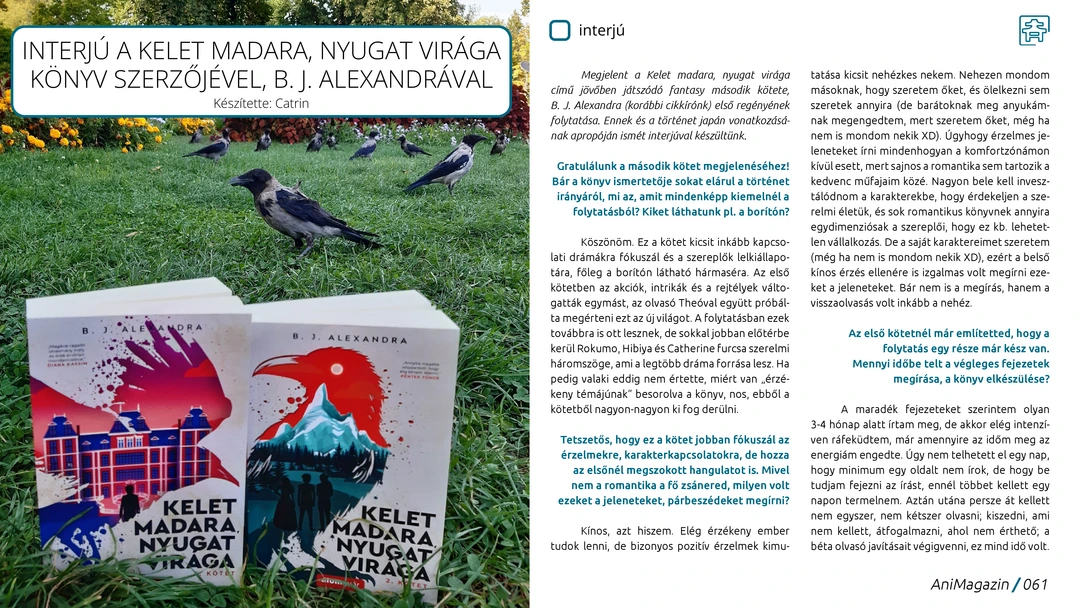 Ame to Kimi to, Nyaight of the Living Cat, Fureru és őszi szezonos anime ajánlók, Aku no Hana és Sengoku Youko mangaajánlók, Nine Puzzles sorozat és Kingdom film bemutatók, Nyári Fantasy Expo beszámoló, interjú a Kelet madara, nyugat virága 2. kötetének apropóján B. J. Alexandrával, Sega történelem, ikigai és booknook bemutatók, valamint további remek cikkek az ingyenes, online AniMagazin legújabb számában!